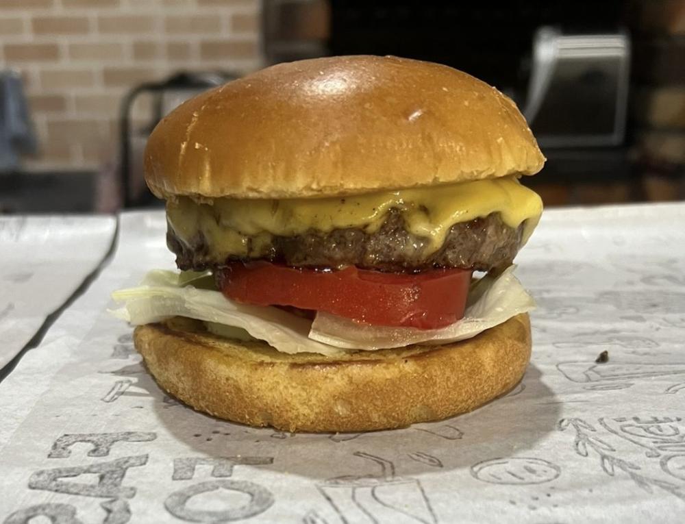 PÃO BRIOCHE, CARNE (150GRAMAS), 2 FATIAS DE MUSSARELA, ALFACE AMERICANA, TOMATE, PICLES E MAIONESE CASEIRA