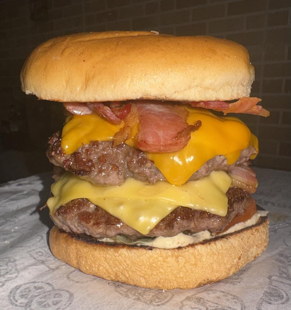 PÃO BRIOCHE, 2 CARNES (150GRAMAS), 2 FATIAS DE MUSSARELA ,2 FATIAS DE CHEDDAR, BACON CROCANTE EM DOBRO, ALFACE AMERICANA, TOMATE E MOLHO L.O.V.E