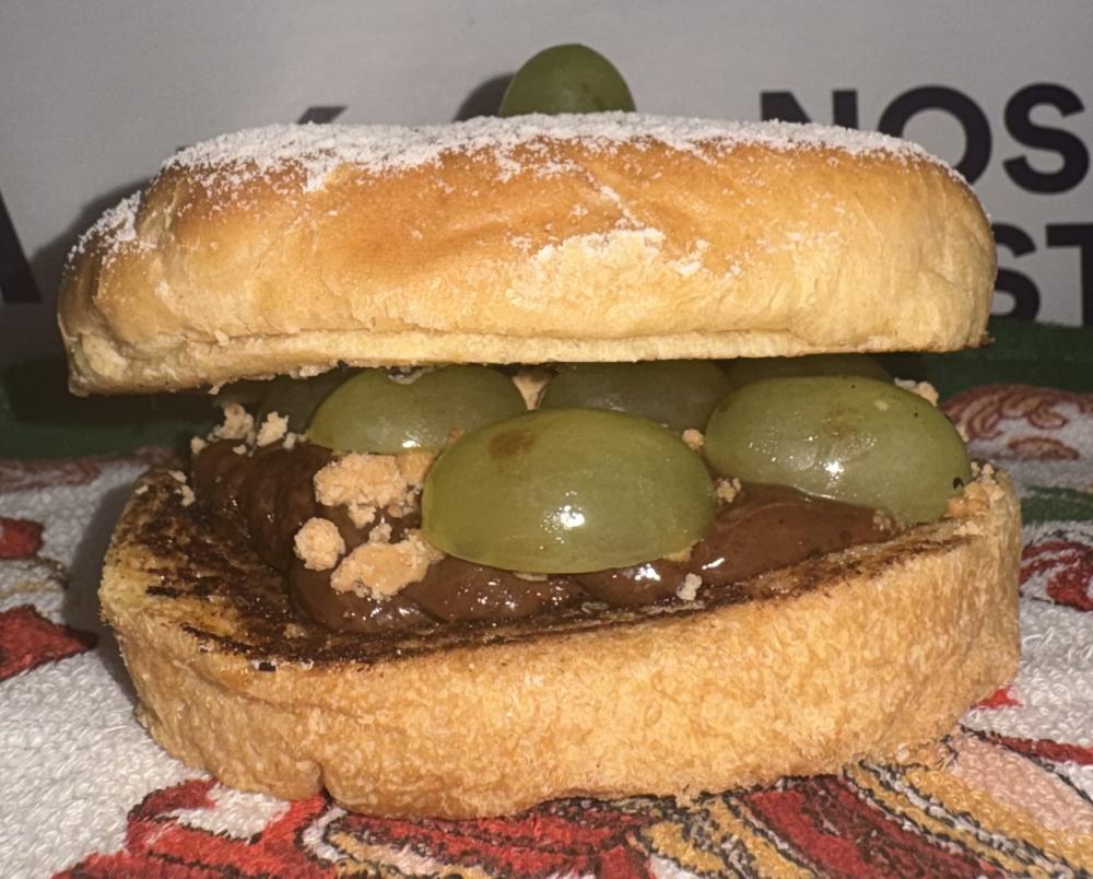 PÃO BRIOCHE AMANTEIGADO COM LEITE CONDENSADO E POLVILHADO COM LEITE NINHO, CREME DE OVOMALTINE, PAÇOCA E UVA
