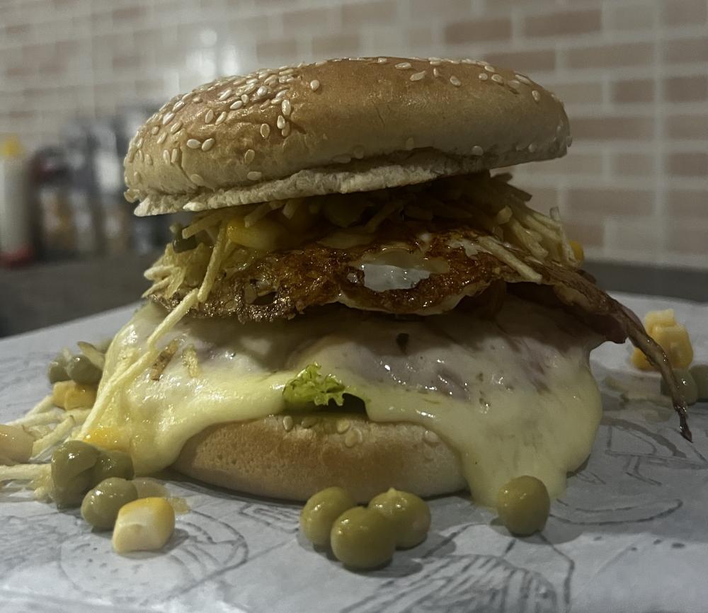 PÃO, MOLHO ROSÉ, CARNE (70 GRAMAS), QUEIJO, PRESUNTO, MILHO, ERVILHA, CATUPIRY, CALABRESA, E BATATA PALHA