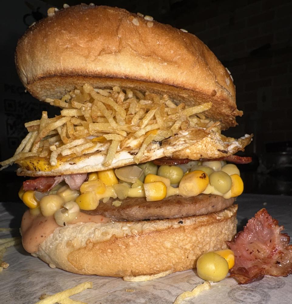 PÃO, MOLHO ROSÉ, ALFACE, TOMATE, CARNE (70 GRAMAS), QUEIJO, PRESUNTO, CHEDDAR, CATUPIRY, CALABRESA, OVO, BACON, MILHO ERVILHA E BATATA PALHA